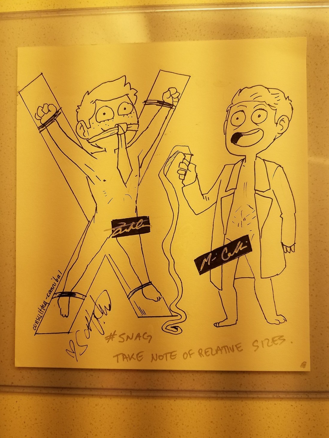 Now this whole time I’m elbows down on the table watching his face because he still hasn’t picked his head up, and he’s just all pursed lips/suppressed smiles/eye crinkles and I’M DYING. So he signs the censor bar very, very carefully, and starts to pass the art back to me, and then changes his mind and pulls it back and writes #snag on it and promptly LOSES HIS SHIT. At which point I also lose my shit (and so do all the volunteers around the table, as it’s now been like a full minute and nobody’s even pretended to try to move us along because everyone’s so fucking amused by this), because he was trying so hard not to break and he just couldn’t hold it in and it was fucking GLORIOUS.