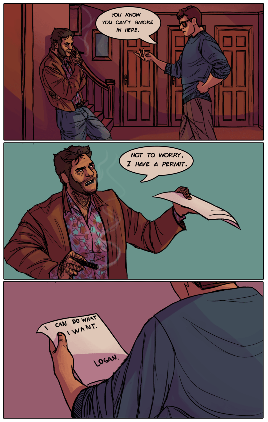He sees me seeing it and panics, pulling his sleeves down.
