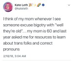 “When your only defence of someone’s attitude is ‘oh, they just grew up in a different time!’, all that means is they lived through the past 50 years of social advancement and didn’t learn a damn thing.”