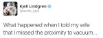 I have that shirt. Thousands of people have that shirt. That shirt is available at Target. Which means actual astronaut Kjell Lindgren, with his wardrobe already full of NASA-issued and logo-emblazoned clothes, was at Target, saw a NASA shirt, and was like, “Yes, I am buying this because this is what I want to spend my actual astronaut salary on.”
